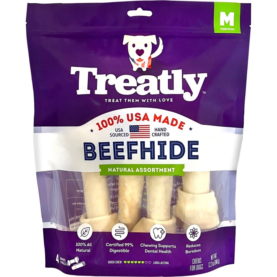 Treatly 100% USA Beefhide Bones & Rolls Natural Medium-4 Pk